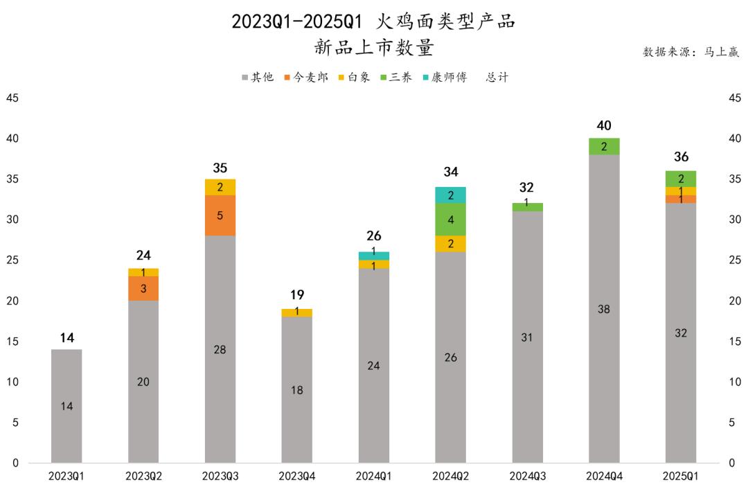 马上赢品牌 CT 中间数据显示,2023 年 4 在过去的两年里,“火鸡面”产品每个月都会在方便面品类上市,上市的新产品数量呈现出一定的增长趋势。推出火鸡面新产品的集团不仅包括康师傅、白象、今麦郎等传统方便面巨头,还包括各种新兴品牌。