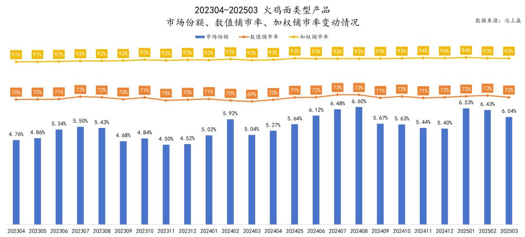 新情绪高涨的背后,火鸡面在方便面品类中一直占据着稳定的“一席之地”。同样,根据近两年的数据,火鸡面产品在整个方便面品类中的比例约为 5%~7%左右,同样呈现出一定的比例增长趋势。