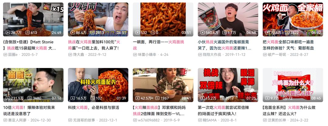 这种对“辣”的考验欲望,促使以辣为核心的火鸡面成为“挑战”的里程碑。大量希望通过“努力工作”获得更多流量的平台博主“一个接一个”挑战火鸡面,迅速形象化火鸡面与辣的绑定,并将其推送给数千名观众。