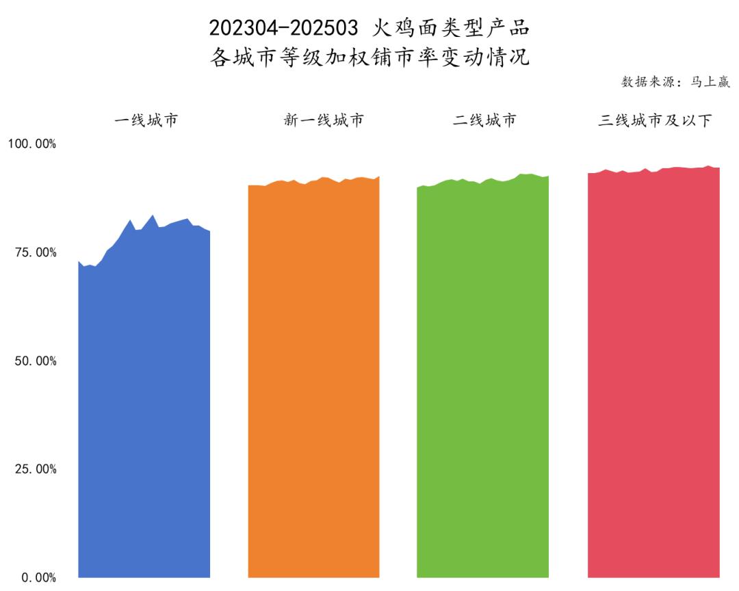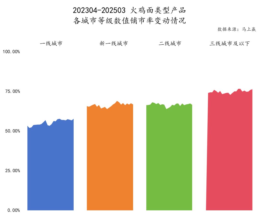 从 202304-202503,火鸡面类商品的数值铺市率和加权铺市率也表现出线下城市铺市率高、线上城市铺市率低的特点。而且一线城市的起伏相对较大,三线城市及以下铺市率有序推进。