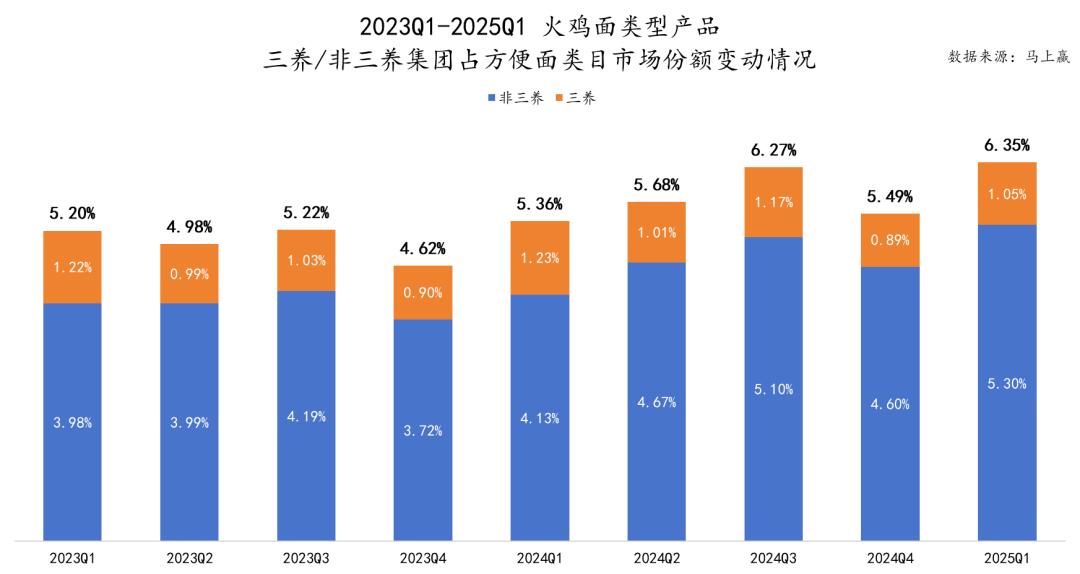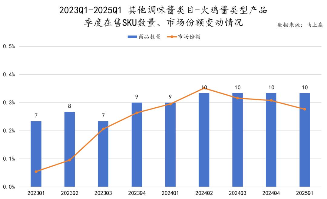 然而,即使从方便面品类转移到调味品类,三养火鸡酱也并非没有对手。由 2023Q1-2025Q1,可以看到,调味料-其它调味酱类别中,仍有十种左右的火鸡酱类型商品,其中包括三养商品,整体市场份额也呈上升趋势。