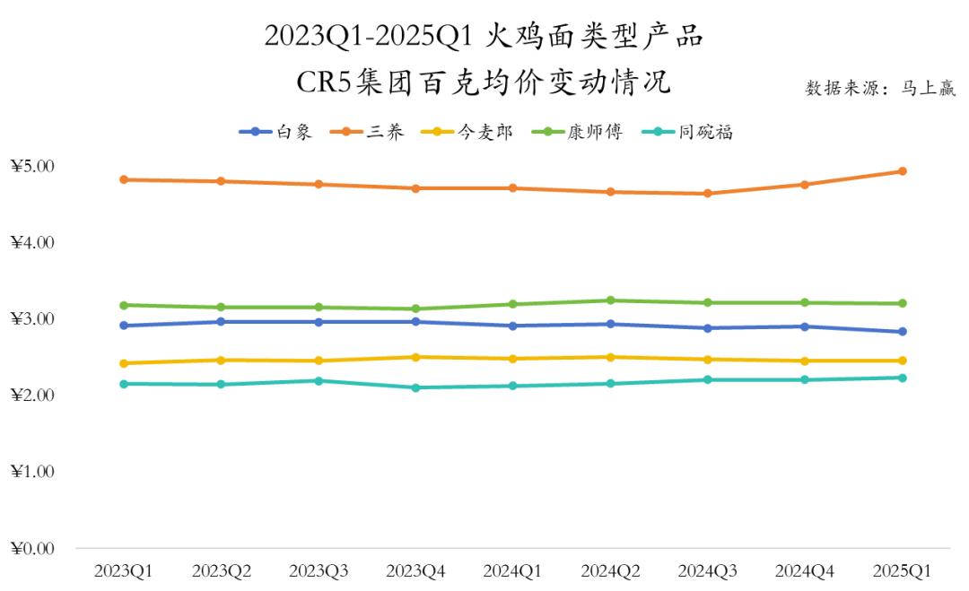 以立即赢得品牌为基础 CT 中 2023Q1-2025Q1 数据显示,白象、今麦郎、康师傅等几个本地集团,其火鸡面产品均价为100克,与火鸡面创始集团三养相比基本略低。 50%上下。