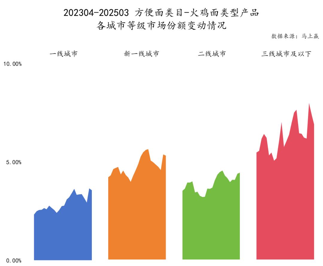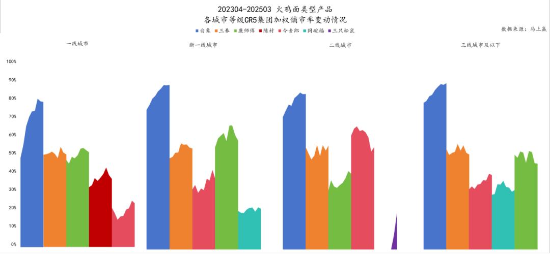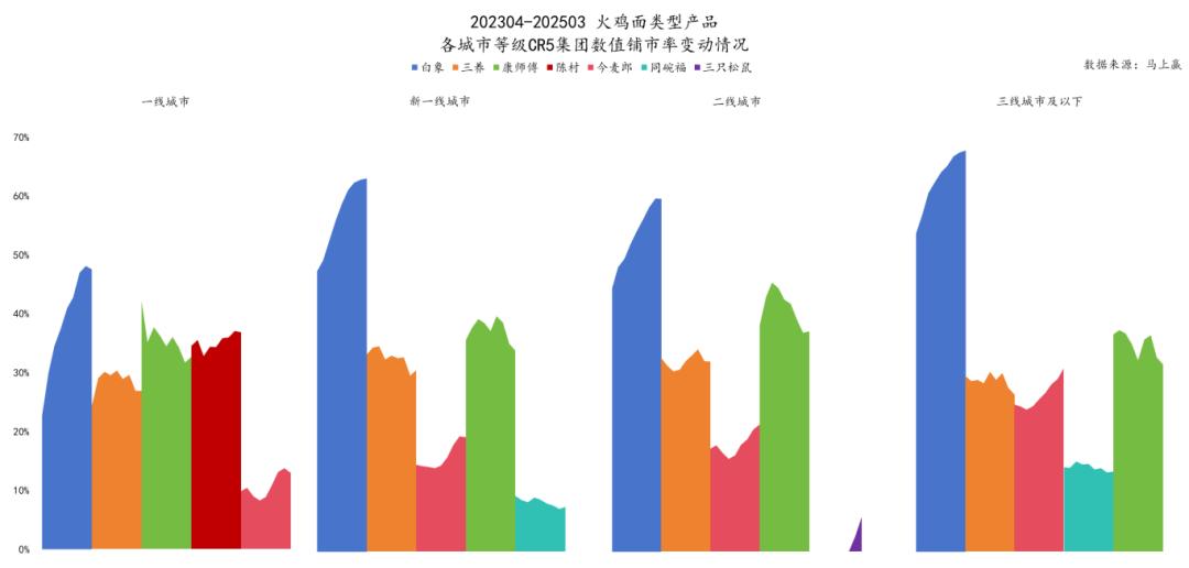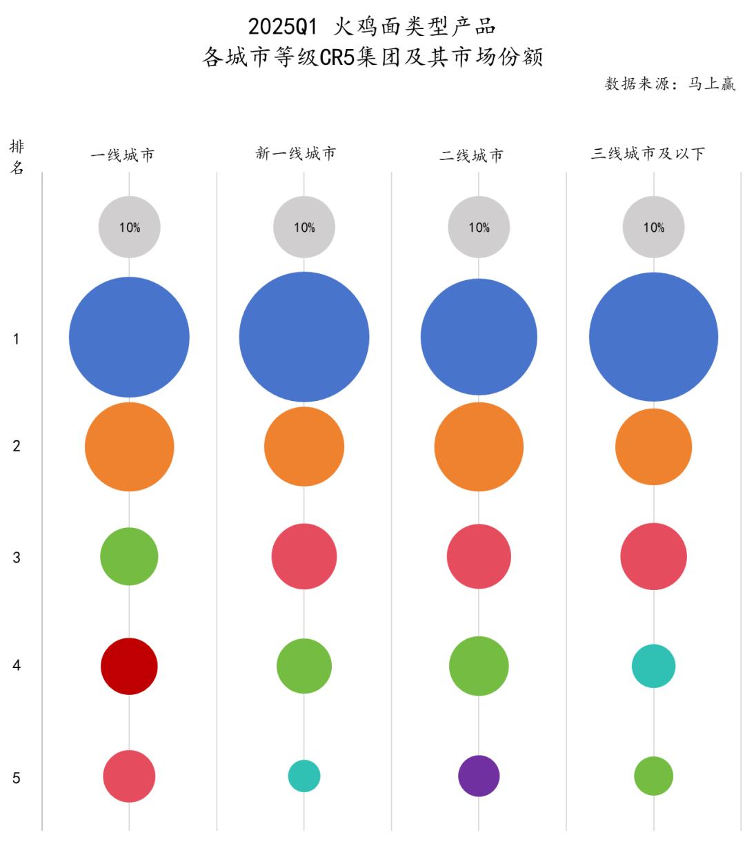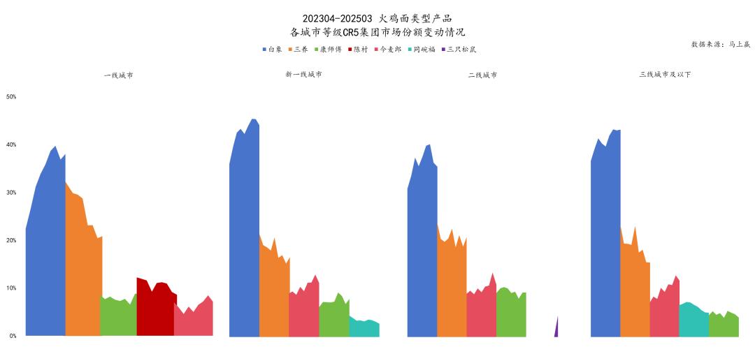 以立即赢得品牌为基础 CT 中等数据,在 2025Q1,以各城市等级的火鸡面型产品为市场份额整体,各城市等级 CR5 集团的第一名和第二名都是白象和第三名。从第三名开始,他们就是今麦郎、康师傅等其他方便面巨头,以及同碗福、陈村、三只松鼠在一些市场上表现不错的集团。