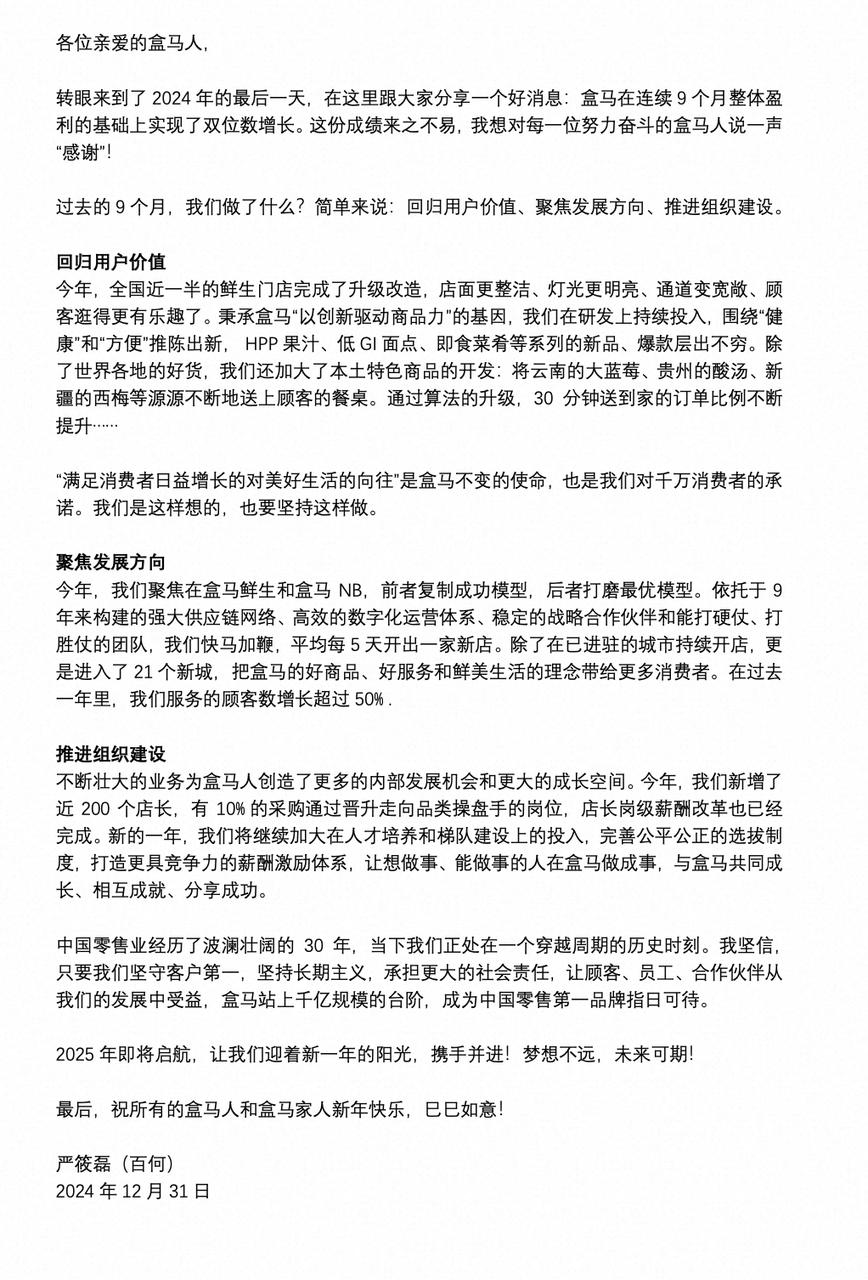 盒马原首席执行官侯毅于2024年3月退休,原首席执行官严筱磊接任侯毅,从上任到现在已经快一年了。