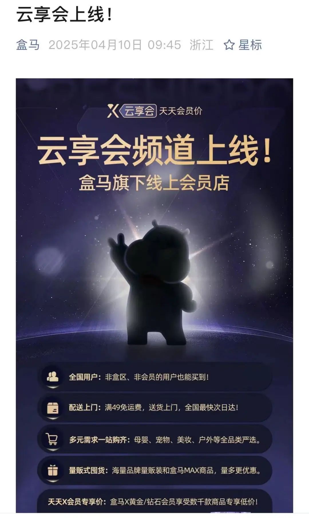 据官方消息,云享会也是盒马云超和盒马X会员店的集合版和升级版。