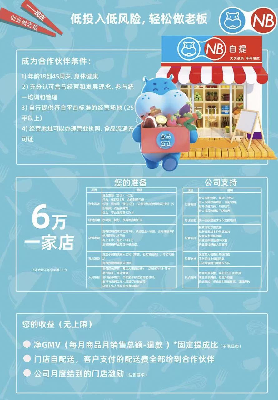 据差评人士介绍,盒马NB自取店有三种加盟方式。一种是找自己的店做自取店,另一种是让自取店“入驻”你现有的店,另一种是直接在家里做一个团点,类似于社区团购的“团长”。