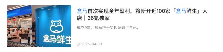 据36氪报道,截至 2025 年 3 月份,盒马首次实现全年盈利(2024 年 4 月至 2025 年 3 月)。