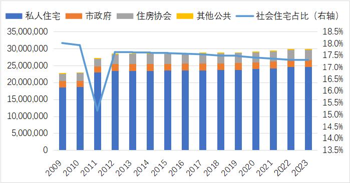 之前的私有化推出 1978 2008年,英国社会住宅竣工套数占住宅竣工套数。 43.9%。经过三年的社会住宅私有化计划,这一比例迅速下降到 29.9%。英国社会住宅于2003年竣工 1.8 万件,占住宅竣工总套数的。 战后新低9.4%。由于社会住宅供应不足,导致排队等候人数从 1999 财年的102 一万人迅速攀升至 2006 年 163 万人。今后,随着政府投资的增加,社会住房数量有所回升,2023年 每年社会住宅竣工套数恢复到总套数。 23.7%。
