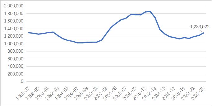 通过身份审查后,申请人被列入等候名单。 3 。由于社会住宅数量少,租金明显低于市场价格,申请非常积极,等待时间较长。根据英国的平衡发展,住房和社区部门 (Department for Levelling up, Housing and Communities) 据统计,2022-23年英格兰社会住宅等候名单上共有128万申请人 (图 5) 。无家可归、居住拥堵、患有疾病的申请人,可根据情况取得相应积分,根据分数提前取得社会住宅名额。
