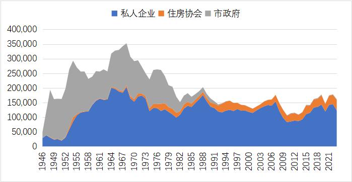 图3: 根据来源分英格兰年新增住宅(套) 资料来源:英国政府官网,Live Table 224: permanent dwellings started and completed, by tenure, England, historical calendar year series