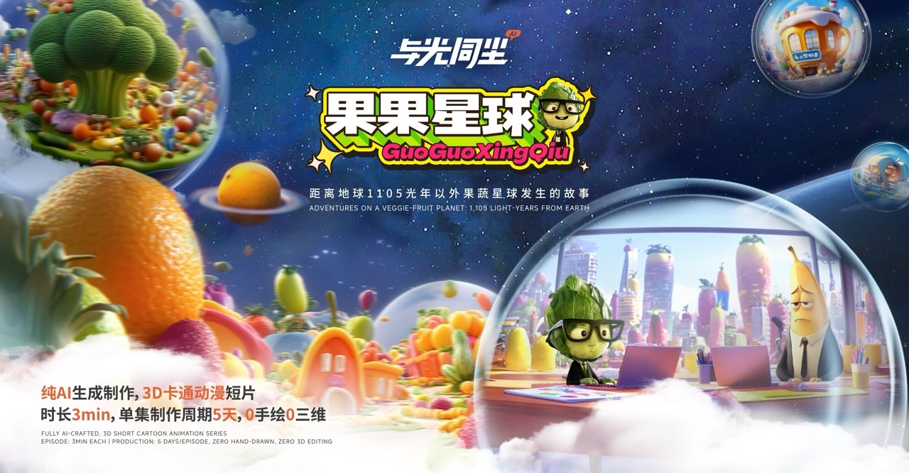 2024年底,「与光同尘」11月16日,世界上第一部纯AI连载动画《水果星球》正式上线。故事设定在遥远的1105光年之外。在一个只有水果和蔬菜的“水果星球”上,主角是一群可爱的水果和蔬菜。人类“吃土星”,他们的冒险开始了。