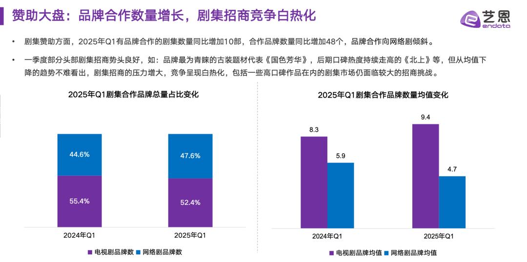 随着冠名人气的减弱,电视剧投资的好坏也出现了。根据艺恩数据发布的《2025年第一季度综合赞助市场洞察》,2025年Q1有品牌合作的电视剧数量同比增长10部,合作品牌数量同比增长48个。