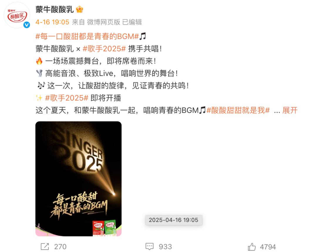 因此,去年的大营销剧和获得多部剧冠名的蒙牛也转移了内容策略,从今年开始,无论是年度S,都回到了“综艺赞助”的怀抱。 级别重磅综艺节目《歌手2025》,或者是平台方力推的创新年番综艺节目《一见你笑》,都被它拥抱在怀里。