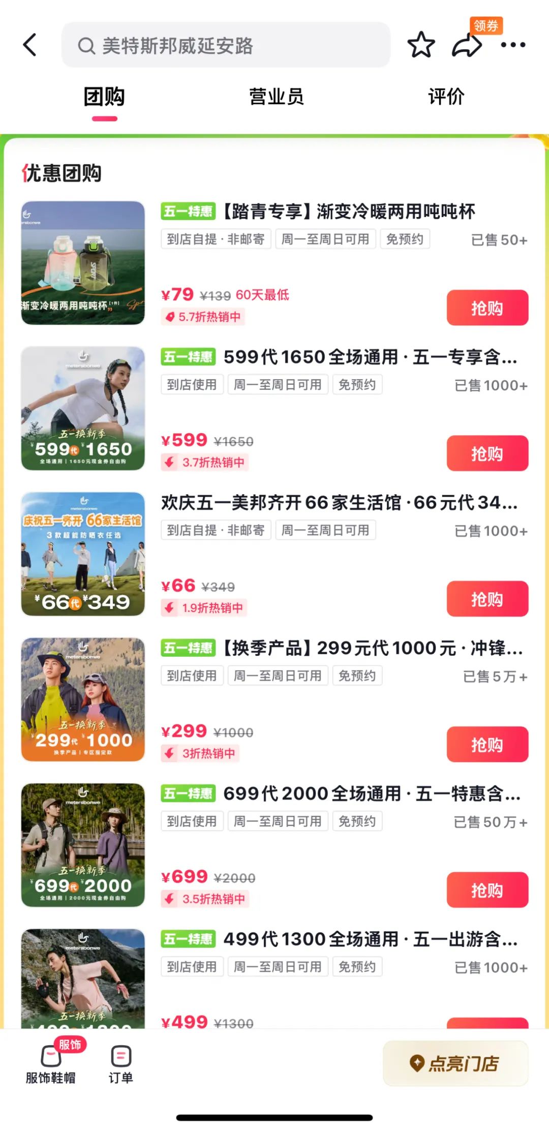 以抖音为例,联商网查阅发现,美邦抖音推出了多项优惠活动,如199元朝500元、299元朝1000元、499元朝1300元、599元朝1650元、699元朝2000元等,针对五一开业的门店,还特别推出了66元朝349元,算下来,服装折扣区间为1.9折至4折。