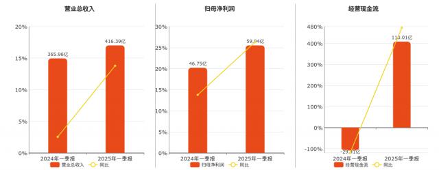 企业总营业收入为 416.39 亿元。归母净利润为 59.04 十亿元。经营活动现金净流入 110.01 亿元。