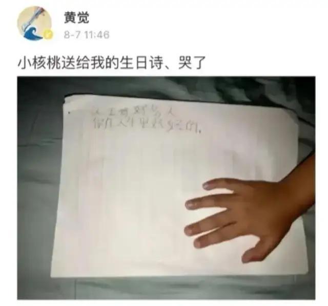 天奶,别说黄觉哭了,就是外人看着都很感动。一个孩子能写出这样的句子,真的很美很感人。这就是孩子对父母的爱。