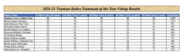 NBA30 支队的所有球员都在 12 候选人中选出最后一名获奖者,此次投票共有一名获奖者。 391 名人参加,按第一选票进行选票。 10 分数,第二选票 7 分数,第三选票 5 分数,第四选票 3 分数,第五票 1 根据规则,选择最高分得主。在这些人中,库里得到了 66 张第一选票,最后得到。 1257 分当选。由投票结果可以看出,库里仅领先排名第一。 2 的亚当斯 20 分数,库里以微弱的优势击败了亚当斯获奖。