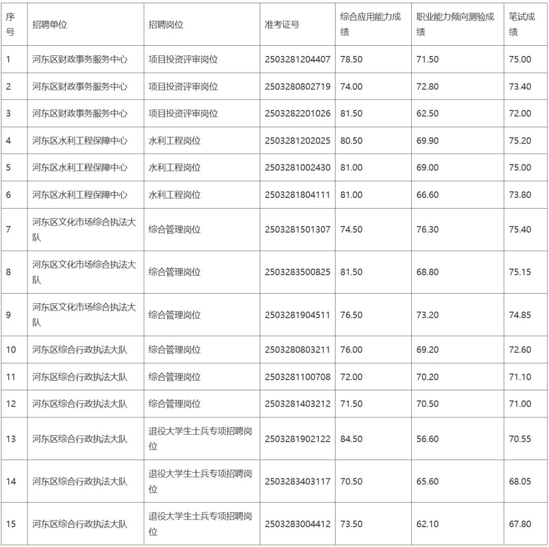 根据《2025年河东区部分事业单位公开招聘综合岗位工作人员公告》,经区事业单位公开招聘主管部门研究,确定2025年河东区部分事业单位公开招聘综合岗位工作人员笔试成绩为50分。笔试成绩以上(含),各招聘岗位进入面试资格考试范围的人员名单按照笔试成绩和规定的比例由高分到低分确定,现公布。