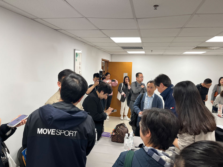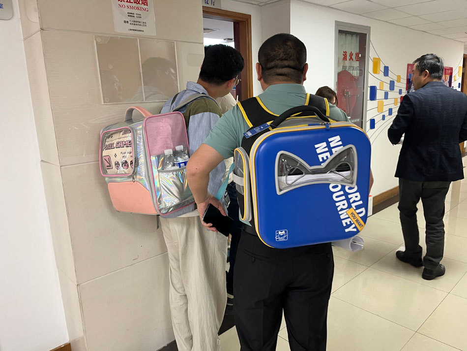 王加刚和同事背着宠物包参加对接会议。 本文图均是 报纸记者 邹娟 摄