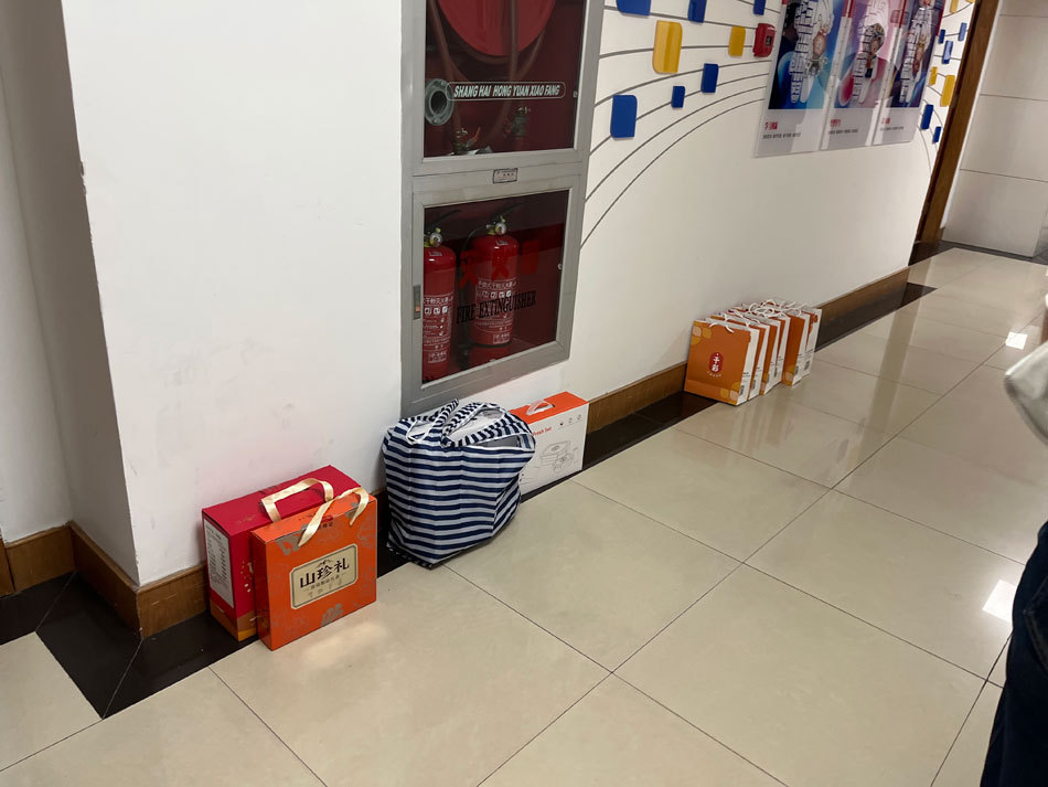 对接会政策宣传室的人太多了,一些外贸公司的负责人把带来的商品放在会议厅外的角落里。