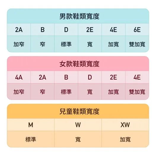 - 对于脚宽的人来说,注意鞋子的大小。男式美码2E和4E(中国显示3和4)为拓宽和超宽,女式美码D和2E(中国显示2.5和3)为拓宽和超宽。