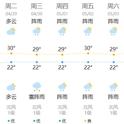四月三十日,阴天,局部有阵雨,气温22-29℃。