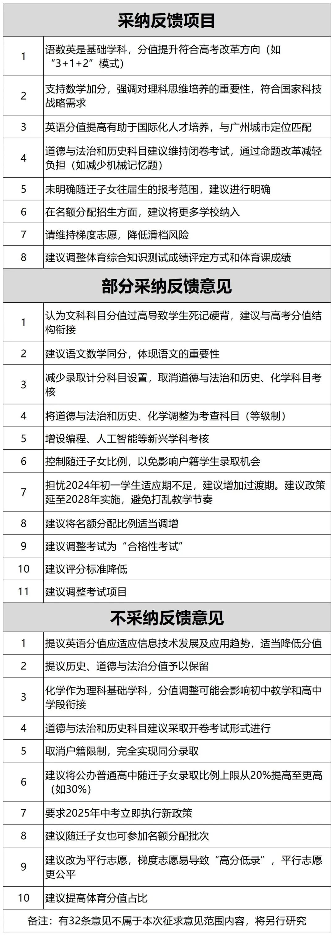 在采纳反馈项目中,采纳了“建议将更多学校纳入名额分配招生”、“请保持梯度志愿,降低滑档风险”等意见;在一些采纳反馈项目中,采纳了“建议语文数学分数相同,体现语文重要性”、“增加编程、人工智能等新兴学科评价”、“控制随迁子女比例,避免影响户籍学生录取机会”、“建议适度增加名额分配比例”等意见。