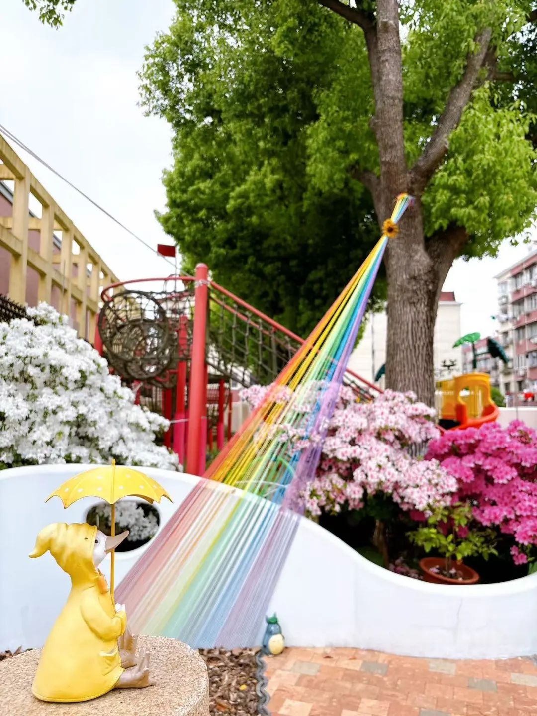 视觉上,幼儿园注重场地内设施设备的色彩饱和度与周围环境色彩的和谐统一。通过巧妙运用“点、线、面”的搭配和错落有致的布局,给孩子带来了更丰富的视觉刺激,激发了他们的想象力和创造力。