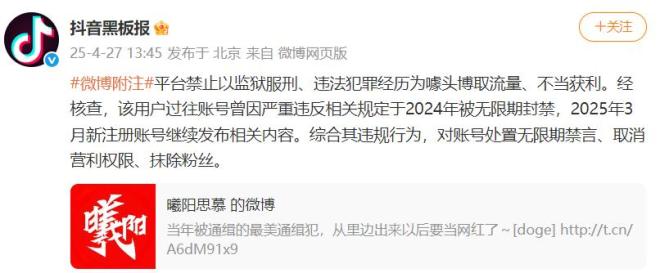 @抖音黑板报 “平台严禁以监狱服刑和违法犯罪经历为噱头获取流量和不当利润。经核实,该用户过去的账户因严重违反相关规定,于2024年被永久禁止,相关内容将于2025年3月继续发布。综合其违规操作,永久封禁账户,撤销营利权限,抹去粉丝。”