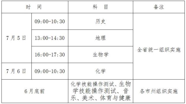 各市、州负责化学技能操作测试、生物技能操作测试、音乐、艺术、体育、健康科目的报名和考试。