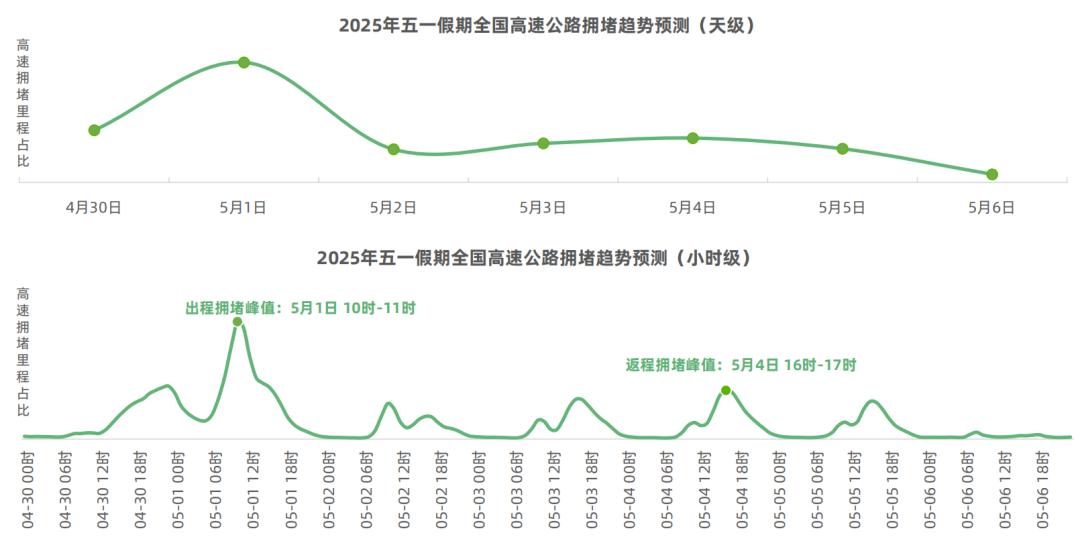 ➢ 2025年五一假期期间,预计高速出行总体交通压力高于回程。预计5月1日(假期第一天)9:00-12:00是出行拥挤的高峰期,峰值出现在10:00-11:00;
