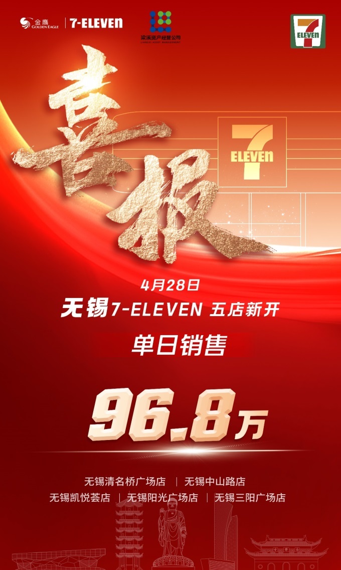 4月28日,金鹰7-Eleven便利店正式进入江苏无锡市场,开启锡城商业地图新篇章。当天,首批五家门店无锡清名桥广场店、无锡中山路店、无锡凯悦汇店、无锡阳光广场店、无锡三阳广场店同步亮相无锡梁溪区核心商圈。4月28日,五家门店单日销售额达96.8万元。