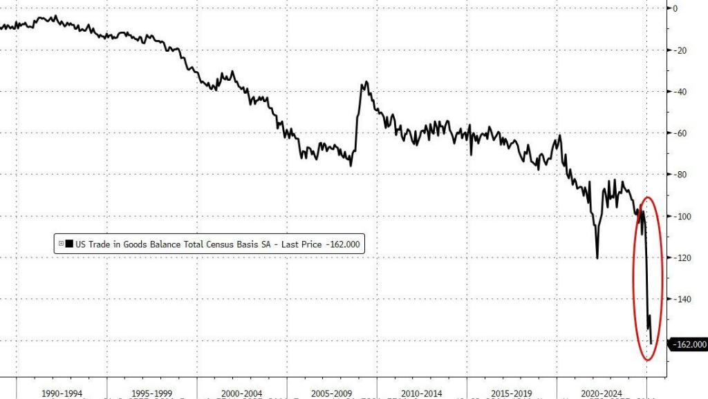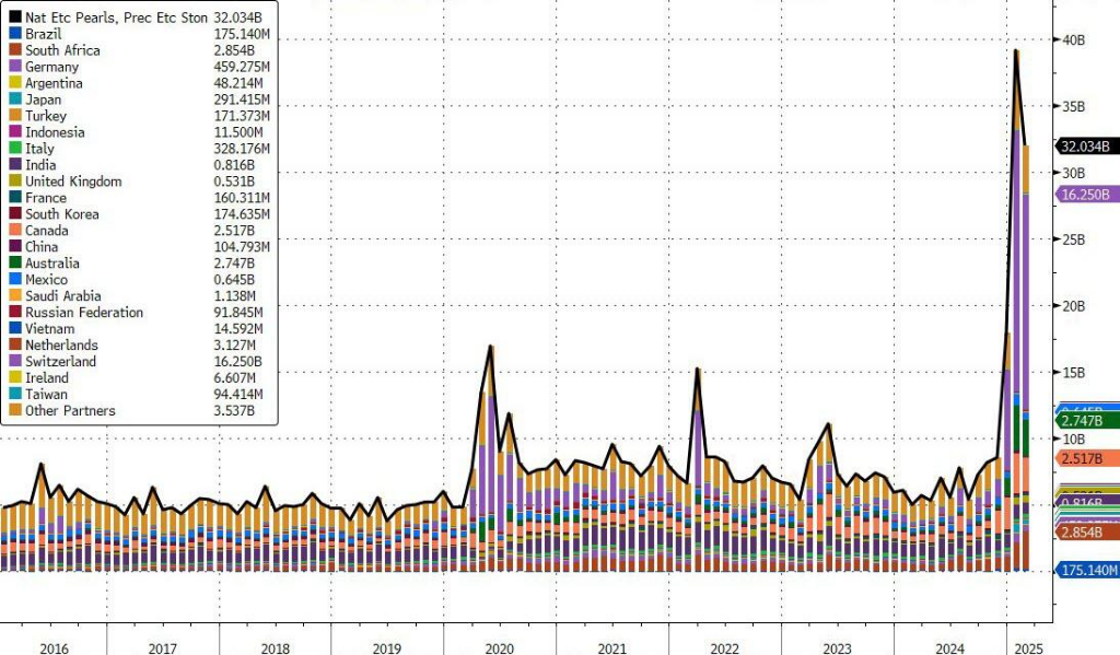 具体来说,进口增加了5%,达到3427亿美元,主要是由消费品推动的。这很可能是因为企业在特朗普总统实施大规模关税之前,渴望“抢走”进口产品;与此同时,非货币黄金的进口也增加了整体进口额。这是进口额连续第四个月创下新高。