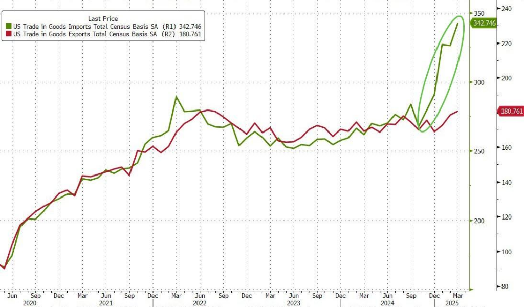 美国3月份商品贸易逆差大幅扩大,在公司集体“抢进口”应对关税的背景下,创历史新高。