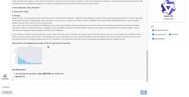 给它一个 Github 库,千问可以自己浏览网页上的信息,总结每一个项目的信息。 star 数字,然后画出柱形图。