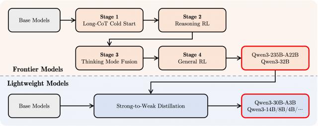但是模型加功能并不像做加法那么简单。Qwen3 这种二合一模型具体是如何训练出来的?