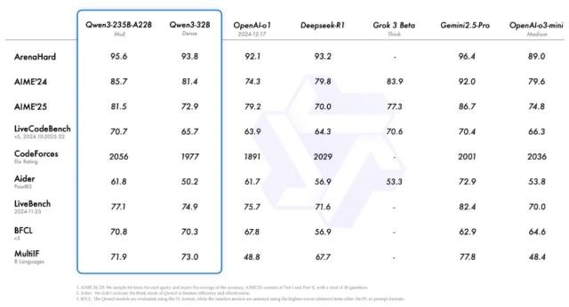 Qwen33根据官方发布的检测结果 国内外主流大模型在多个测试集中的表现并不多,尤其是代码和数学方面。