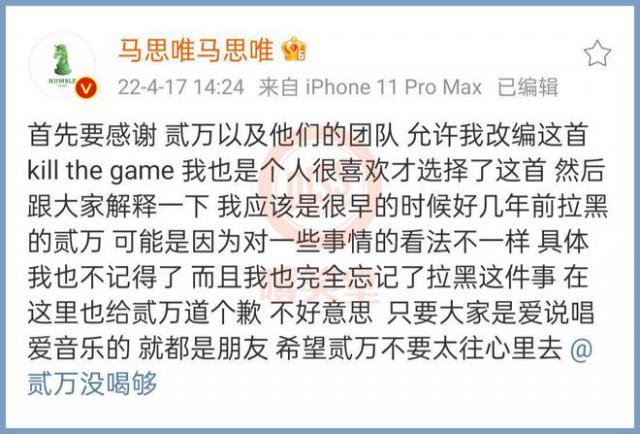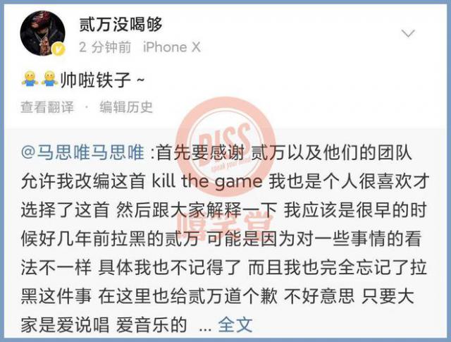 “在这里,我也向2万道歉。对不起,只要我们热爱说唱和音乐,我们都是朋友。我希望2万不要太在意。”