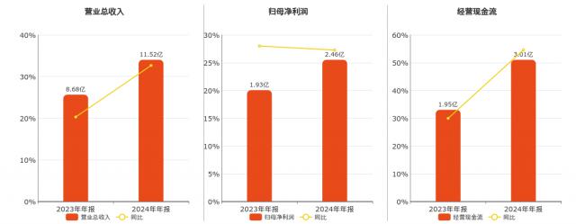企业总营业收入为 11.52 在已披露的同业公司中,亿元排名第一。 十三。归母净利润为 2.46 十亿元。经营活动现金净流入 3.01 亿元。