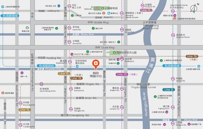 位置优越的上海博鑫中心,靠近中环线、外环线两大城市的高速公路和银都路隧道,便于到达上海各地。公园距浦东国际机场49公里,虹桥枢纽18公里,靠近机场接触线景洪路站,可以快速直接到达浦东国际机场和虹桥机场。与此同时,园区还靠近地铁15号线景洪路站,公交车与地铁站无缝衔接,助力安心通行。周围还有轨交19号线和23号线。