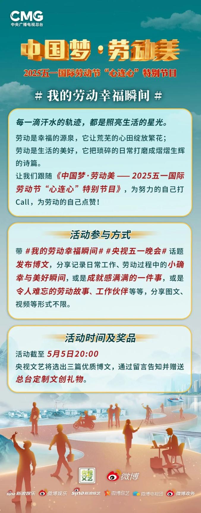 即日起至5月5日20日:00,带#我的劳动幸福瞬间# 和#央视五一晚会#发布博文,一起分享美好的劳动瞬间!高质量的博文也有机会获得总台文化创作的礼物。来参与吧!展示你的劳动风格!