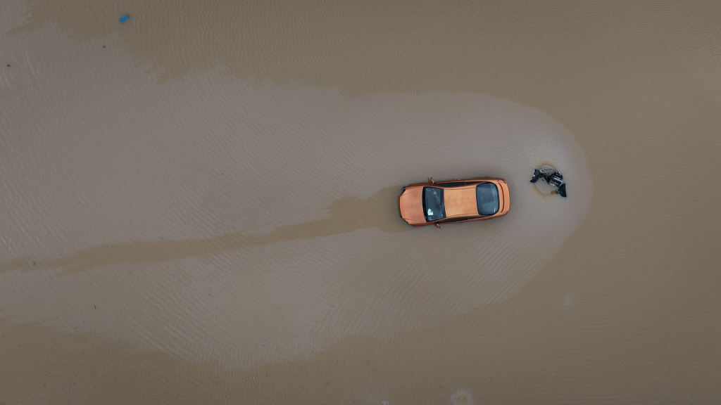 美国密苏里州波普拉布拉夫,当地时间2025年4月6日,一辆汽车被洪水淹没。