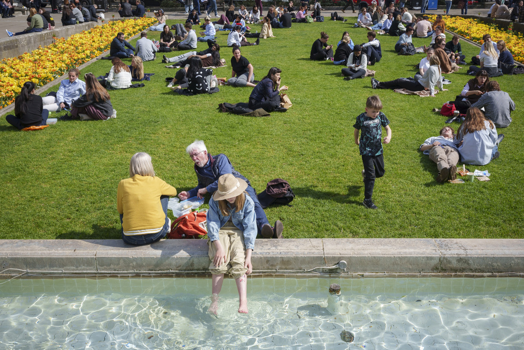 英国伦敦,当地时间2025年4月8日,人们在喷泉中解暑。