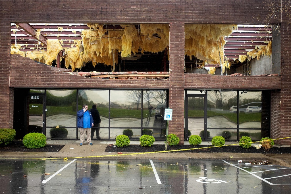 美国肯塔基州路易斯维尔,当地时间2025年4月3日,建筑被龙卷风破坏。