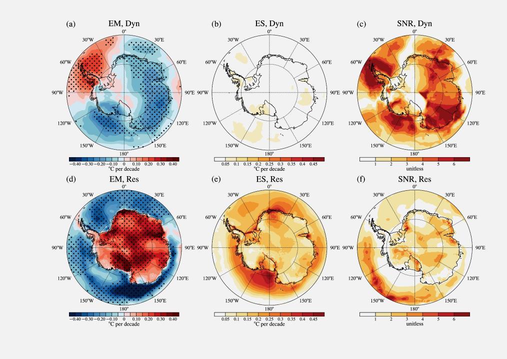 结果表明,南极大陆总体上呈现出明显的升温趋势,以每10年0.12℃的速度升温,略低于同期全球平均水平。研究表明,南极温度变化是多种物理工艺共同作用的结果。另一方面,大气环流的变化,通过影响向极地输送热量,进而控制南极温度,这个过程被称为“动力过程”。另外,海柔和海冰等的变化,也会引起向上热量输送的变化,从而影响局部及周围的温度,这个过程被称为“热过程”。研究小组对这两个物理过程对南极地区温度变化的贡献进行了定量评估。结果表明,“热过程”是驱动南极温度升高的主要因素,提供的温度升高效应约为每10年0.22摄氏度;而“动力过程”则导致整个南极大陆以每10年0.10℃的速度降温,部分抵消了热温升高的效果。