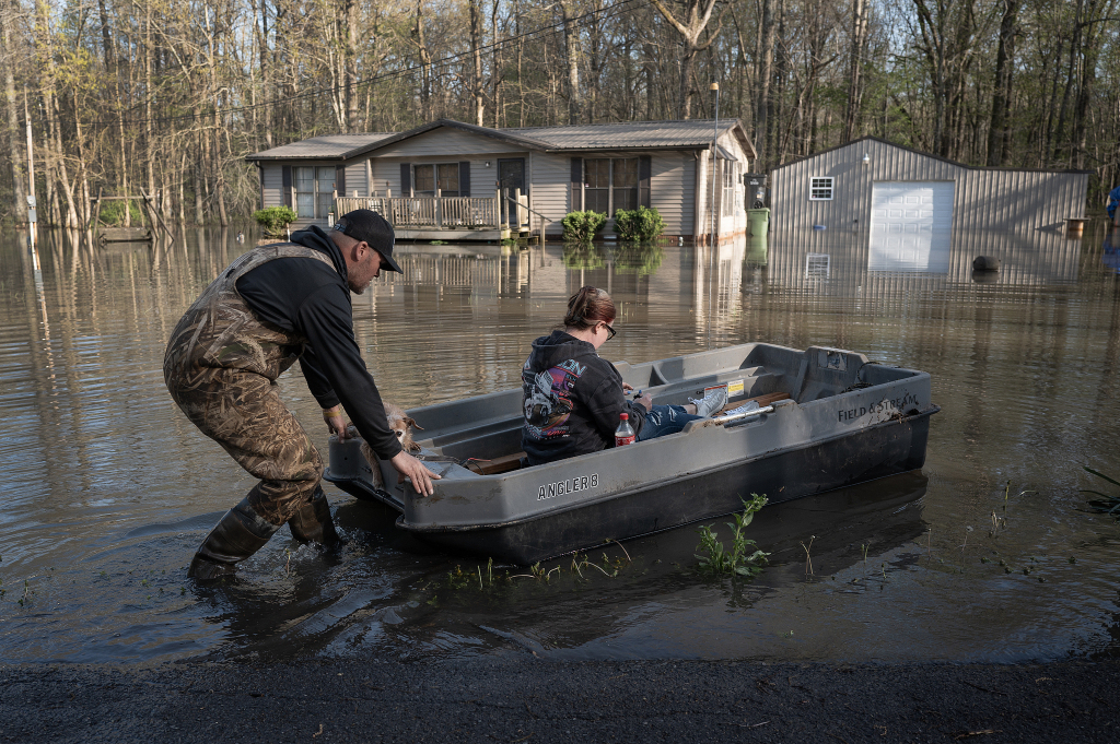 当地时间2025年4月7日,肯塔基州帕杜卡遭遇暴雨,人们乘船出行。