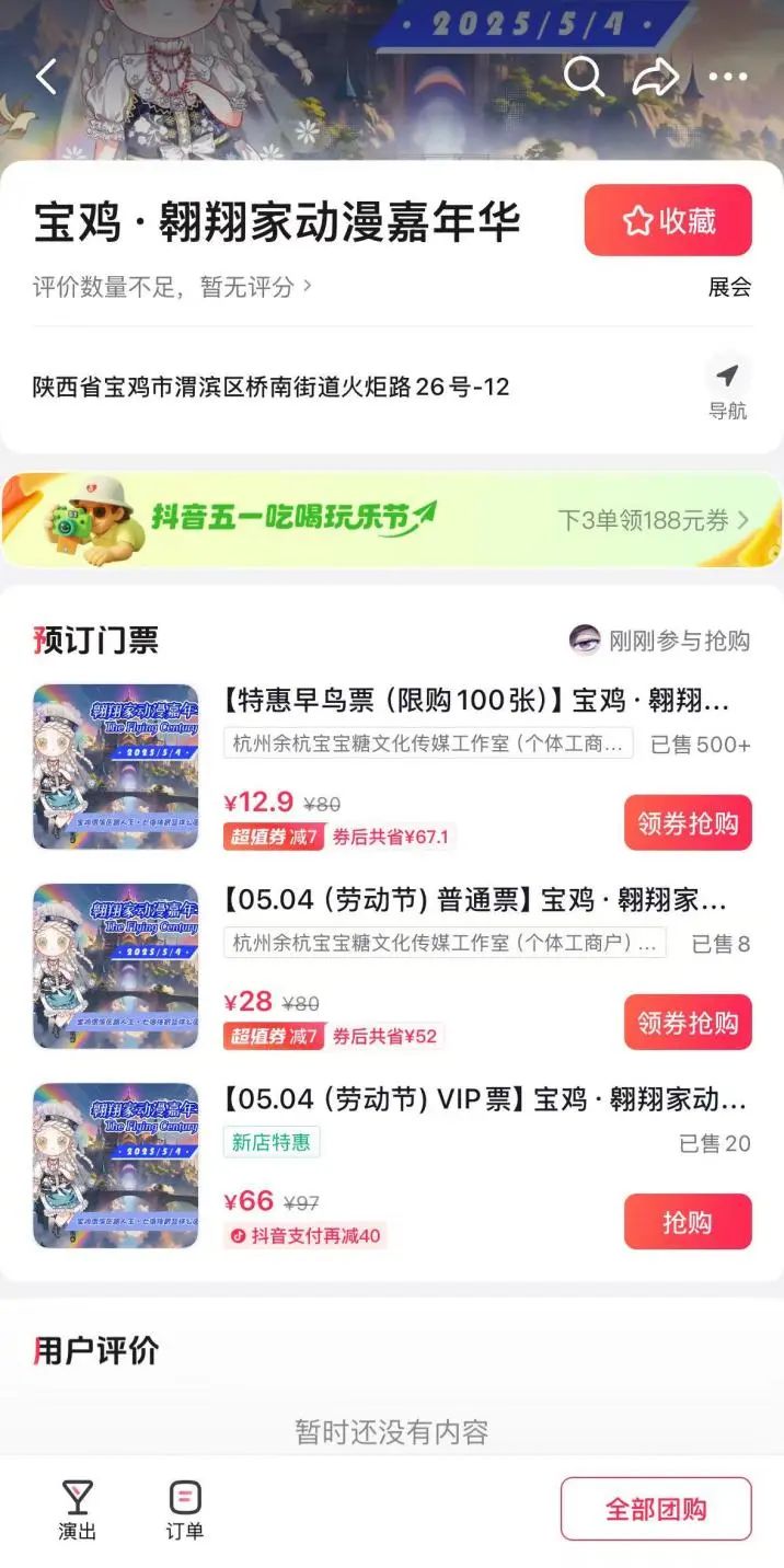 各种平台的本地生活业务有助于推广小城镇展览。比如在Tiktok里,一张原价80元的展览门票,只需要12.9元就可以拿到。。这个部分来自抖音的补贴,实际上帮助小城漫展培养了一批坚实的观众。