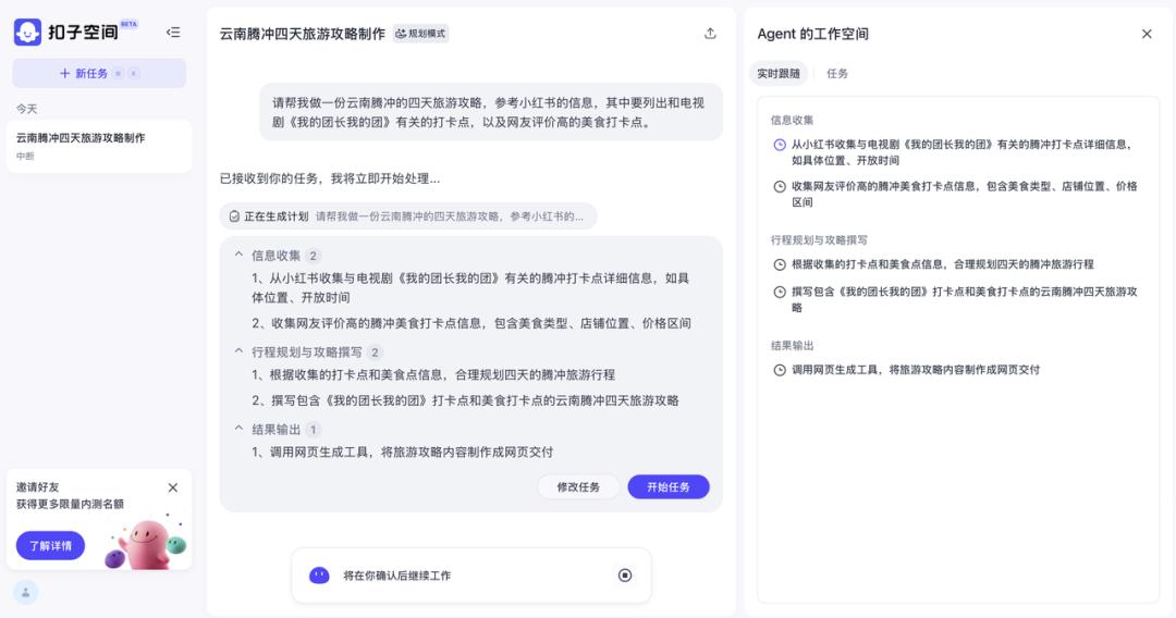 从使用的角度来看,纽扣空间更擅长文字梳理。但是当整理出来的文字转换成网页时,按钮空间的效果会降低。。我们试图生成一个腾冲旅游策略、一个网页和一个AI新闻总结,展示秦灭六国的过程。腾冲旅游策略的文字版应该更详细。转换成网页后,信息量会被稀释,食物的图片也会出现问题。最后两个任务不尽如人意。