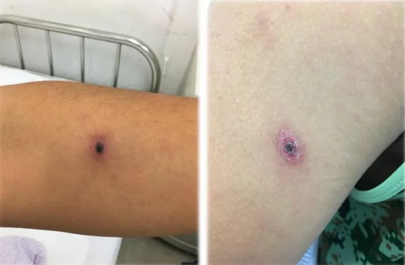 病人被祸虫叮咬后焦痂样皮疹。受访者提供图片