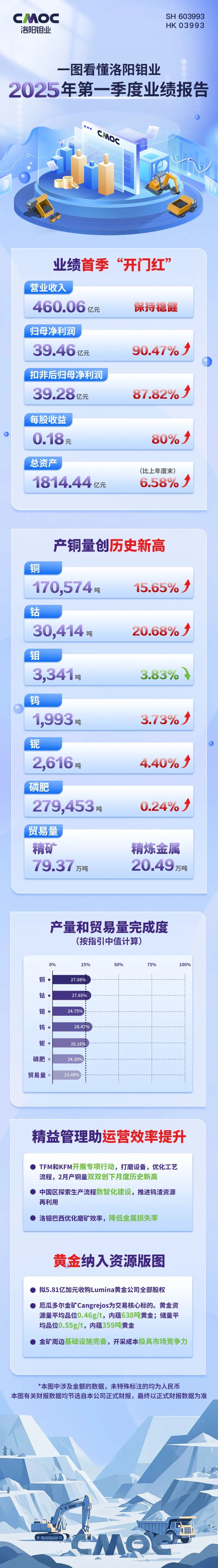四月二十五日晚,洛阳钼业公布第一季度业绩报告显示,公司实现营业收入460.06亿元;归母净利润39.46亿元,同比增长90.47%;扣除后归母净利润39.28亿元,同比增长87.82%;基本上每股收益0.18元,同比增长80%。